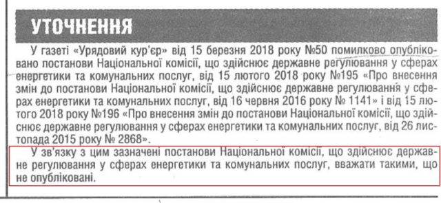 Це виражається в тому, що друковане видання Кабміну «Урядовий кур’єр» не публікує рішення Комісії. А в законі про регуляторі зазначено, що рішення НКРЕКП вступає в силу лише після публікації в газеті Кабміну.