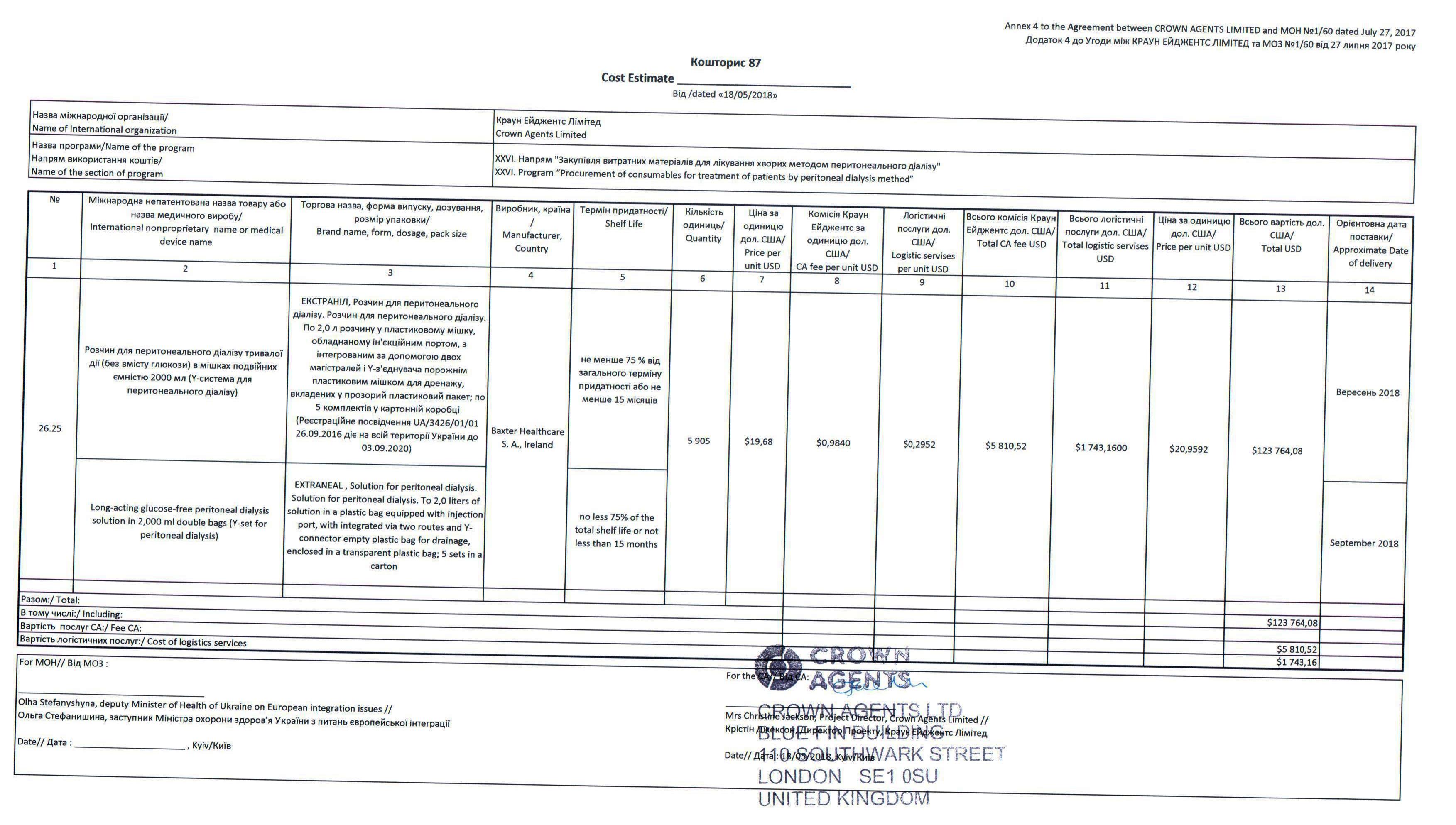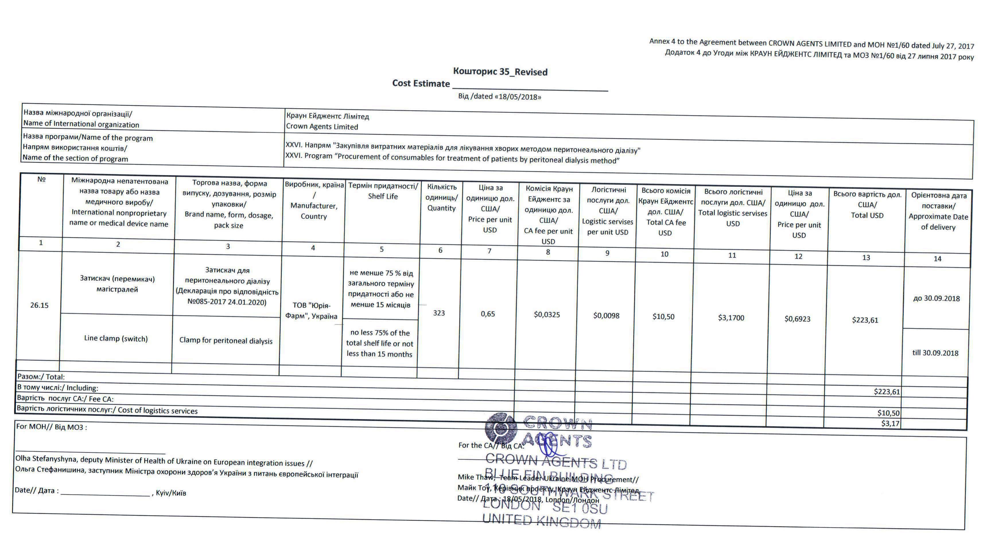 Дані кошториси організація «Краун» надіслала Міністерству охорони здоров’я у рамках виконання умов договору від 27 липня 2017 року. «Краун» зазначає, що дана редакція кошторисів включає збільшення відсотку відшкодування витрат по наданню послуг із супроводження товарів до 1,5% від вартості отриманого товару.