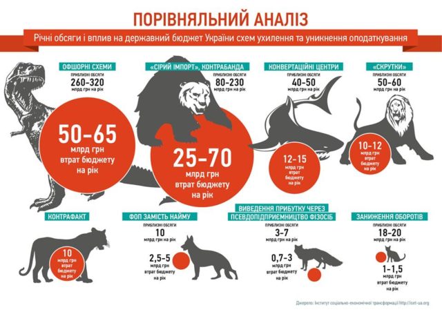 За даними Інституту соціально-економічної трансформації приблизні обсяги контрабанди і порушення митних правил в Україні становлять 80-230 млрд грн на рік, і з них до бюджету не сплачуються 25-70 млрд грн ПДВ і мита. Саме «митні» схеми йдуть другим рядком після офшорних.