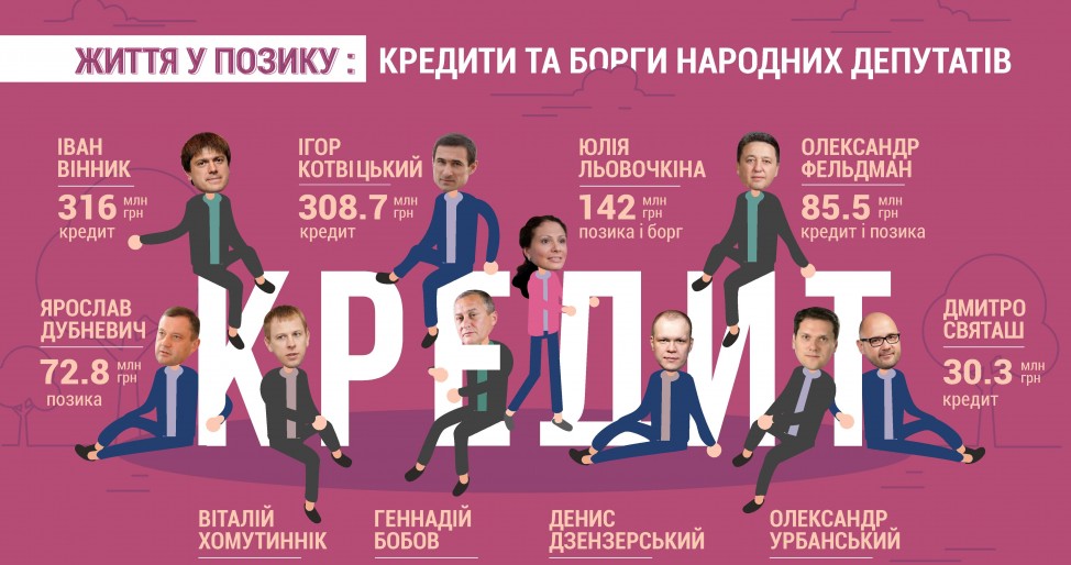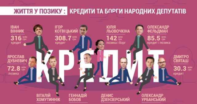 №1 – Іван Вінник (БПП) набрав кредитів у «Альфа Банку» та «ПриватБанку» на 316 млн гривень. Верховний суд навіть заборонив Віннику виїжджати за межі України до їх повного погашення, а державна виконавча служба щомісяця стягує з депутата 20% зарплатні (близько 4 тисяч). З такими темпами для повного розрахунку депутату знадобиться більше 6 тисяч років.