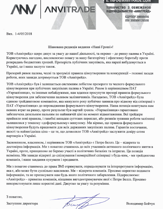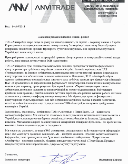 Після опублікування цієї інформації до «Наших грошей» надійшов лист від зам директора фірми «Анвітрейд». У листі наголошується на позитивних аспектах впровадження формульного ціноутворення та тому, що фірма «не бере участі в політичних баталіях та інтригах».