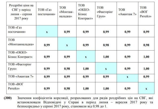 Так, значення коефіцієнтів кореляції, розрахованих для рядів роздрібних цін компаній із вибірки протягом липня-вересня 2017 року та у серпні того ж року становили від 0,98 до 1. Це, пояснили антимонопольники, свідчить про «взаємозалежність цінових траєкторій відповідачів у справі».