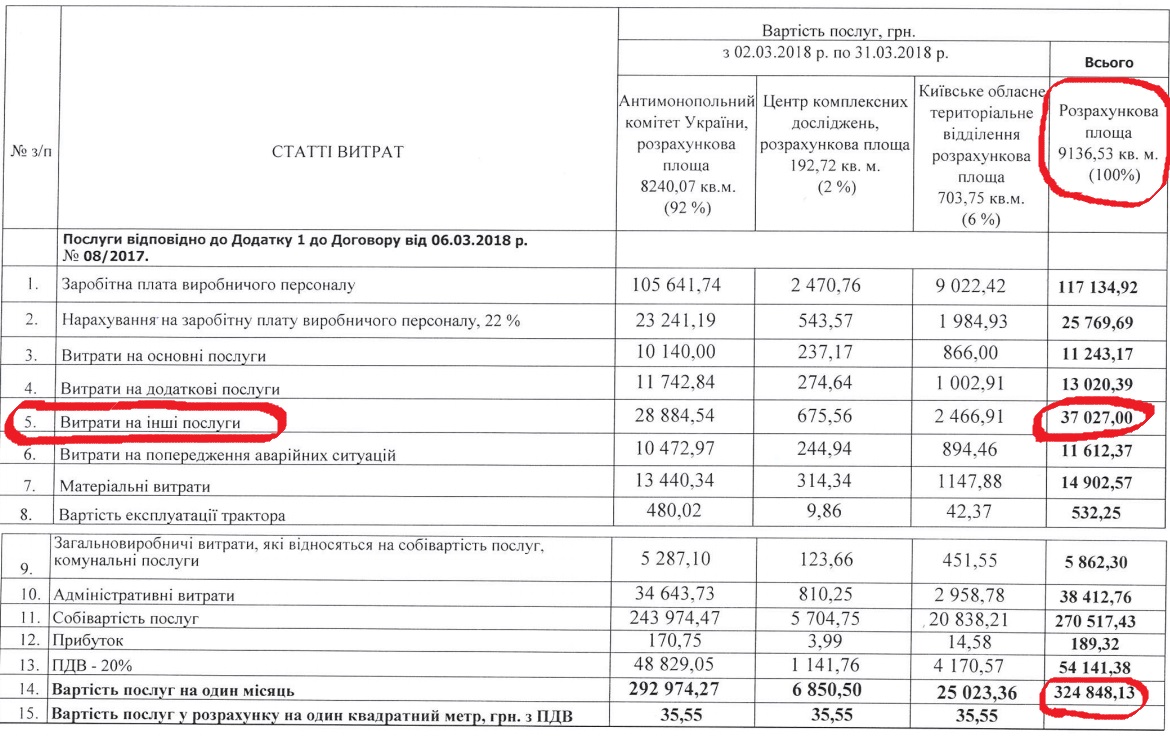 Із 2 березня до кінця року обслуговуватимуть будинок по вул. Липківського, 45 площею 9 137 кв. м, де знаходиться АМКУ, його Київське тервідділення і Центр комплексних досліджень з питань антимонопольної політики. Послуги в березні обійдуться у 325 тис грн., або 36 грн./кв. м, а далі – по 337 тис грн. за кожен місяць, або 37 грн./кв. м.