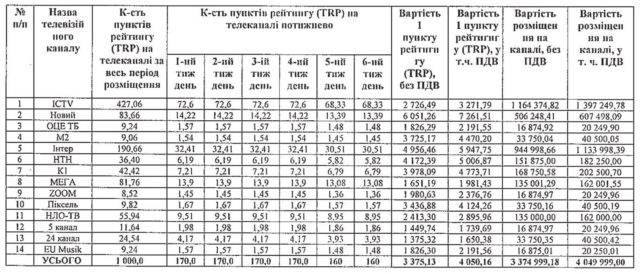 Одиниця послуги (TRP) коштує від 1 650 грн. на 24 каналі до 7 262 грн. на Новому.