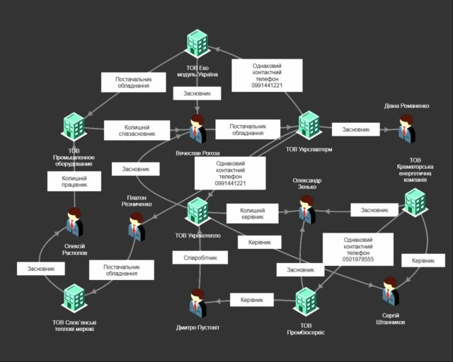 Самі ж постачальники альтернативного тепла в Слов’янські школи пов’язані між собою. Мова йде про ТОВ «Промышленное оборудование», ТОВ «Укрекотепло», ТОВ «Укрславтерм», ТОВ «Слов’янські теплові мережі», ТОВ «Промбіосервіс» та ТОВ «Краматорська енергетична компанія».