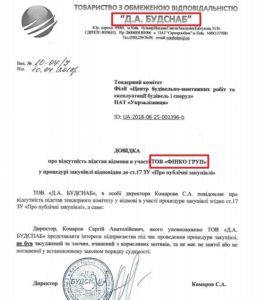 Серед документів в тендерній пропозиції «Д.А. Будснаб» є довідка про аналогічні договори, де клієнтом фірми є ТОВ «Фінко Груп», яке приймало участь в сумнівних тендерах залізниці. Директором «Фінко Груп» є також мешканець Хрустального Комаров Микита Анатолійович. Тобто, аналогічний договір був нібито підписаний між фірмами братів Комарових.