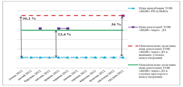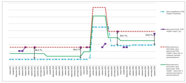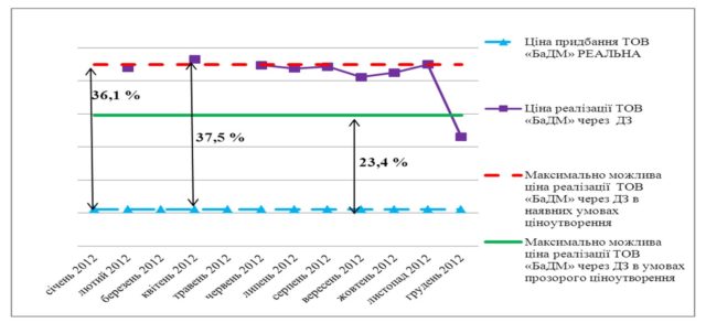 На графіках видно, що «по нормальному», тобто в умовах прозорого ціноутворення, ціни на медпрепарати для лікарень не мали б перевищувати реальну закупівельну ціну більш ніж на 23%. Однак, з урахуванням бонусів ціни для бюджетників могли сягати уже плюс 36% над реальною закупівельною ціною. Так, компанії збували ліки тримаючись цих «роздутих» завдяки бонусам меж, а у «БаДМ» подекуди дозволяли собі заходити ще далі – накидаючи до вихідної ціни 37%.