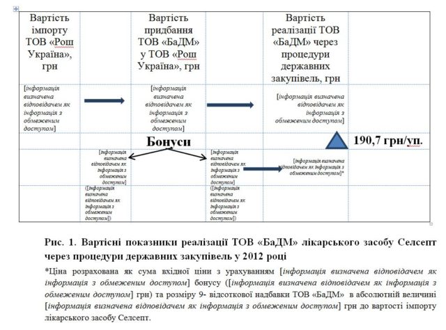 І ще. Дані щодо показників продажу компанією «БаДМ» препарату «Селсепт» на публічних закупівлях свідчать, що у 2012 році фірма збувала бюджетникам упаковку Селсепту з переплатою у 190 грн/уп.