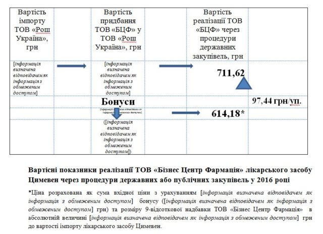 Незважаючи на те, що українські дистриб’ютори цього та інших препаратів отримували додаткове «фінансове заохочення», антимонопольники зафіксували, що ціна того ж Цимевену була на 7,5% вищою від ціни на цей же препарат, замовлений через міжнародні організації.