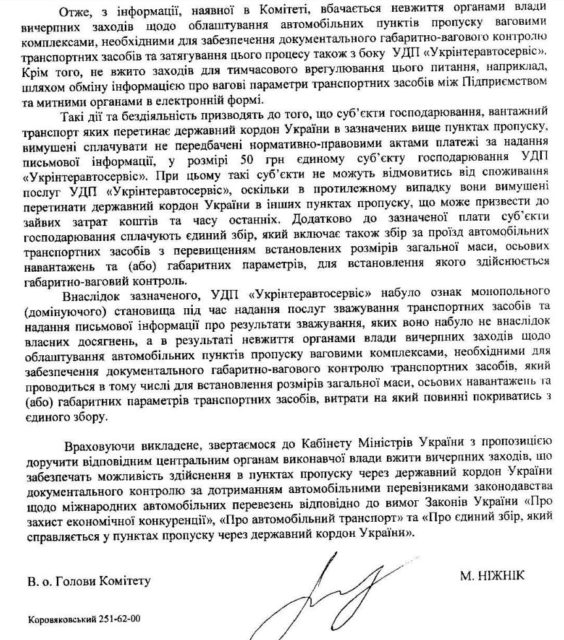 Перевізники ж поскаржились в Антимонопольний комітет, що підприємство позбавляє їх права вибору і нав’язує платну послугу, яка мала б бути безкоштовною. При цьому, якщо вони відмовляються платити «за інформацію» вагових параметрів на пунктах пропуску «Чоп», «Дякове», «Ужгород» та сервісній зоні «Тиса», працівники «Укрінтеравтосервісу» не видають роздруківку щодо ваги, а митники – не приймають такий транспорт для оформлення.