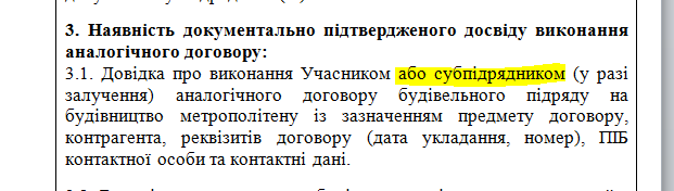 У новому тендері метрополітен прибрав норму, яка дозволяла брати участь у торгам «прокладкам». У перших торгах замовник дозволив учасникам торгів декларувати не власний досвід виконання аналогічних робіт, а доводити його наявність у субпідрядників: