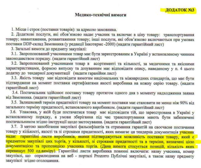 Однією з вимог тендерної документації було надання учасниками закупівлі на підтвердження можливості поставки ліків гарантійного листа від виробника (авторизаційного листа). Дана умова, йдеться у додатках до документації, стосується позицій, кількість яких перевищує 500 одиниць.
