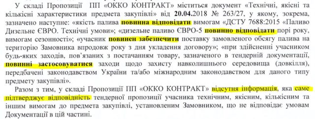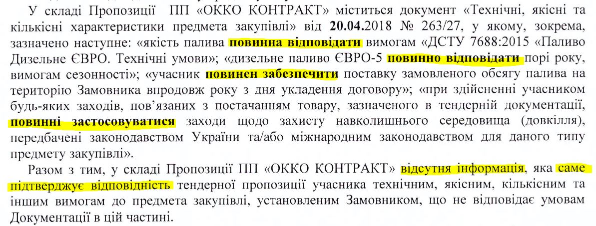Чотири інші фірми не допустили до аукціону з однієї причини. Вони скопіювали форму документа «Технічні, якісні та кількісні характеристики предмета закупівлі» зі словами типу «повинна відповідати» чи «повинен забезпечити» замість того, щоб заповнити його ствердно. Йдеться про ТОВ «Техойл НК» і ТОВ «Євролім», а також про ПП «ОККО Контракт», яке змінило у проекті договору розмір забезпечення виконання договору з 0,75% на 0,5%, і ТОВ «Белойл Сістем», яке не мало антикорупційної програми.