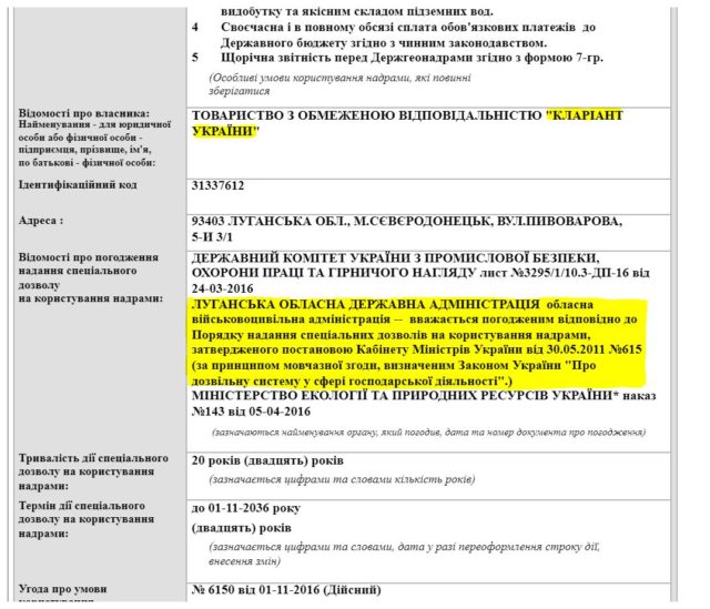 Протягом трьох років зволікаючи із видачею нового спецдозволу для «Кларіант Україна», у Держгеонадрах посилались на відсутність погодження на його отримання обласною радою, у даному випадку – Луганською облрадою. При цьому, у Службі не зважали на той факт, що рада припинила свою діяльність у квітні 2014 року, а відтак не могла надати таке погодження. Законодавством не передбачена також можливість погодження надання надр у користування суміжними облрадами.