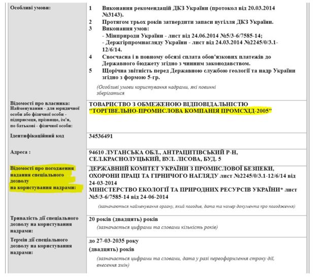 27 березня 2015 року Держгеонадра видала ТОВ «Торгівельно-промислова компанія “Промсхід-2005”» спецдозвіл на видобування кам’яного вугілля на Луганщині без погодження із Луганською облрадою чи Луганської обласною ВЦА.