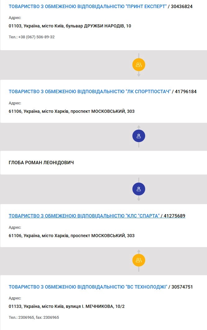 За даними системи «YouControl», торік Катерина Самар володіла харківським ТОВ «ЛК Спортпостач», яким тоді керував Олександр Цемеров. Нині цю фірму переоформлено на офшор «Імтекс Коммерс Ко., Лтд» із Сейшелів, а керує нею Роман Глоба. Він також очолює харківське ТОВ «КЛС «Спарта», зареєстроване там само на той же офшор. У минулому році ця компанія належала Володимиру Степанюку і Валентину Короваю.