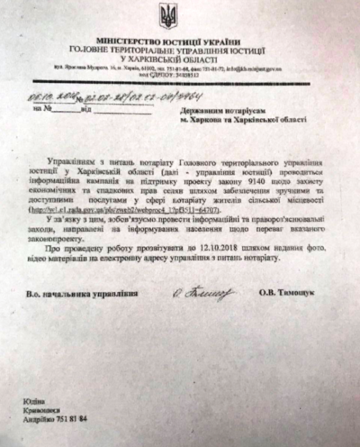 Державних нотаріусів Харкова та Харківської області змушують «провести інформаційні та правороз’яснювальні заходи, направлені на інформування населення щодо переваг» законопроекту 9140 «Про внесення змін до деяких законодавчих актів України щодо створення передумов для захисту економічних та спадкових прав громадян в сільській місцевості».