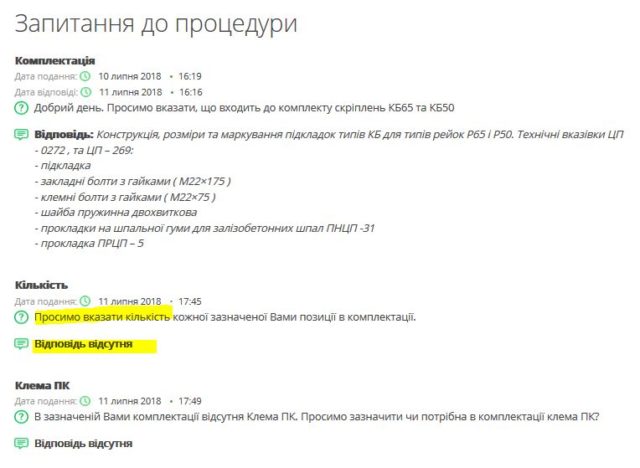 Зрештою переможець тендера не вказав у своїй пропозиції комплектацію скріплень. Також ця інформацію була відсутня і у договорі, укладеному за результатами тендеру.