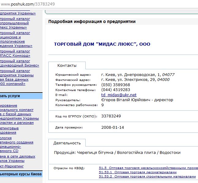 Столичний «Торговий дім Мідас Люкс» зі статутним капіталом 33 тис грн. має чотирьох працівників, орендовані автомобіль та офіс, власні стіл, стілець, три ноутбука і принтер.