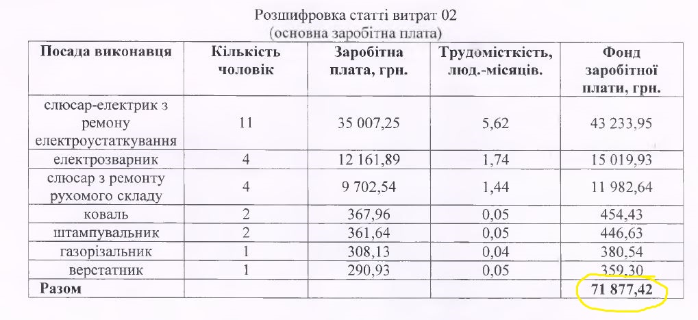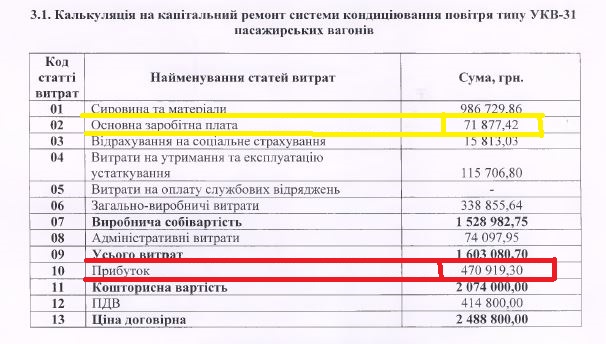 В кошторисі передбачено встановлення нових систем кондиціювання КВ-1-28 виробництва харківської компанії «МК «Енергозберігання» Віктора Барського і Любові Волокіти по 933 тис грн. за один вагон. Решту коштів відведено різні витрати і відрахування, серед яких прибуток «Дніпровагонрембуду» з кожного вагону становитиме 470 тис грн., а видатки на основу зарплату 25 робітників, що працюватимуть над кожним вагоном – лише 72 тис грн. за весь період ремонту.