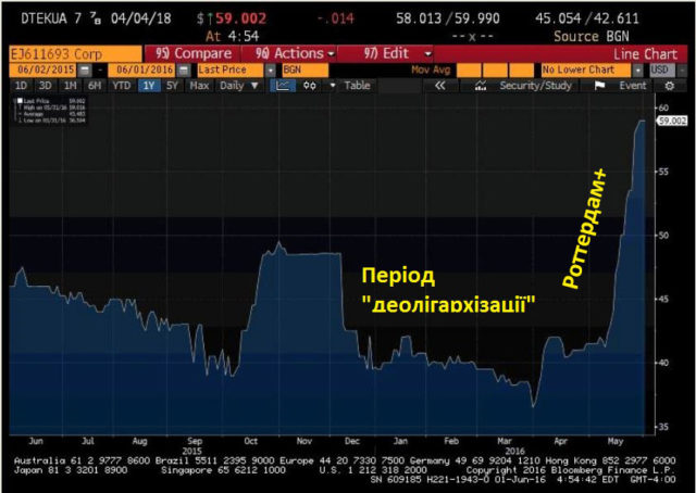 Петро Порошенко зробив дуже мудро, коли у 2015 році почав деолігархізацію. Тоді президент і його міністр енергетики Володимир Демчишин (співвласник інвесткомпанії ICU, що обслуговувала Порошенка) за допомоги словесних інтервенцій довели Ріната Ахметова до стану, у якому єврооблігації ДТЕКу подешевшали у півтора рази. А потім ICU їх скупила задешево. А інший співробітник ICU та «Рошену» Дмитро Вовк на чолі НКРЕКП забезпечив з тим же самим Міненерго впровадження формули «Роттердам+». І єврооблігації ДТЕК відразу пішли вгору, бо у фірми Ахметова прибутки почали рости шаленими темпами. Ось на графіку дані “Блумберга” дані щодо ціни єврооблігацій: