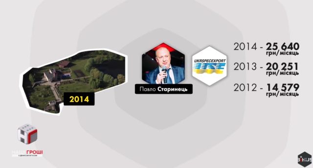 На різних посадах в державному «Укрспецекспорті» Старинець працює 15 років. В 2014 році, коли було придбано елітний маєток, його зарплата складала в середньому 25 тис грн. на місяць. У попередній рік, ще менше – у середньому до 21 тис грн.