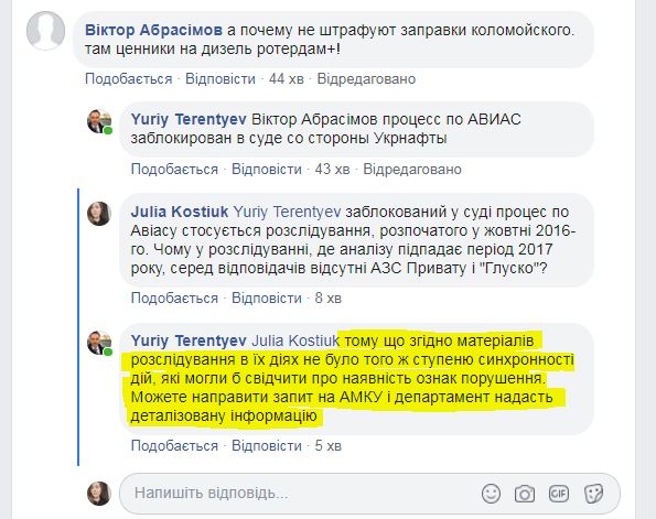 У відповідь на запитання, чому у розслідуванні змови найбільших нафтотрейдерів протягом 2017 року відсутні мережі АЗС «Привату» та «Глуско», керівник АМКУ відповів, що у їхніх діях не було зафіксовано «того ж ступеню синхронності, що могло б свідчити про наявність ознак порушення».