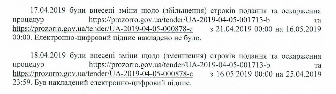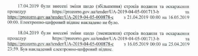 За даними майданчика, 17 квітня було збільшено кінцевий строк подання пропозицій з 21 квітня на 16 травня без накладення ЕЦП, а 18 квітня було зменшено кінцевий строк подання пропозицій з 16 травня на 25 квітня з накладенням ЕЦП.