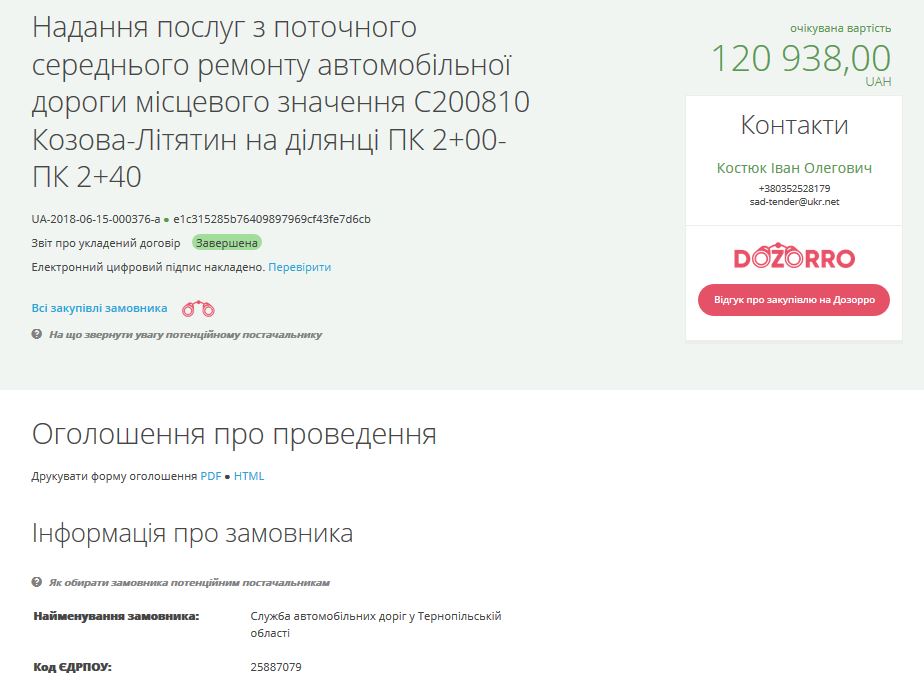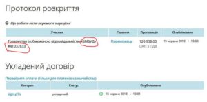 Таким чином у червні 2018 року Тернопільська САД уклала з однією фірмою ТОВ «БМбуд» 177 угод на загальну суму 26,8 млн грн. Ось скріншот одного з таких оголошень у «Прозорро», де чітко видно – Тернопільська САД укладала угоди саме з ТОВ «БМбуд» з кодом ЄДРЮО 41037833.