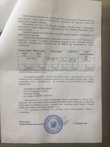 Держкомпанія вимагає у ОСББ 11 тис грн за неспожиті у березні 4 тис кубометрів газу. ОСББ за договором від жовтня 2018 року замовляло 40 тис кубометрів газу. Однак за підсумком березня 2019 року фактично було спожито лише 36 тис кубометрів, що більші наж на 5% менше від замовлення. Саме на цю різницю неспожитого газу «Нафтогаз» і виставив вимогу оплатити 11 тис грн з розрахунку 7 482 грн за тисячу кубометрів. Ці кошти «Нафтогаз» у акті називає «відшкодуванням збитків».