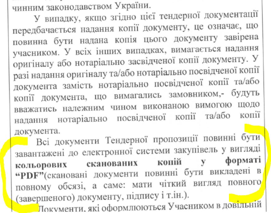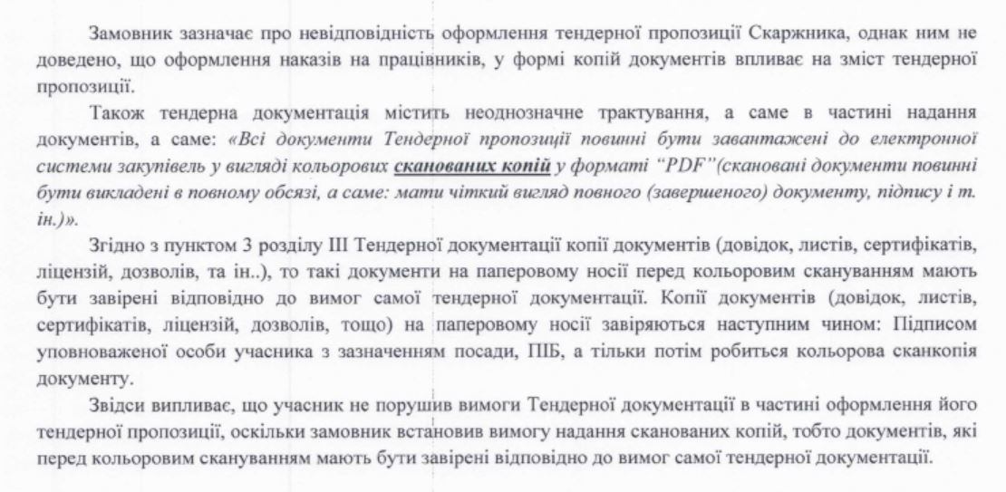 Таким чином замовник дав учасникам торгів на свій розсуд трактувати цю вимогу – завантажувати скановані оригінали, чи скановані копії оригіналів, завірені відповідним чином. «УПС» завантажив PDF-файли з кольоровими копіями документів. І у своїй скарзі відмітив на неоднозначність вимог замовника.