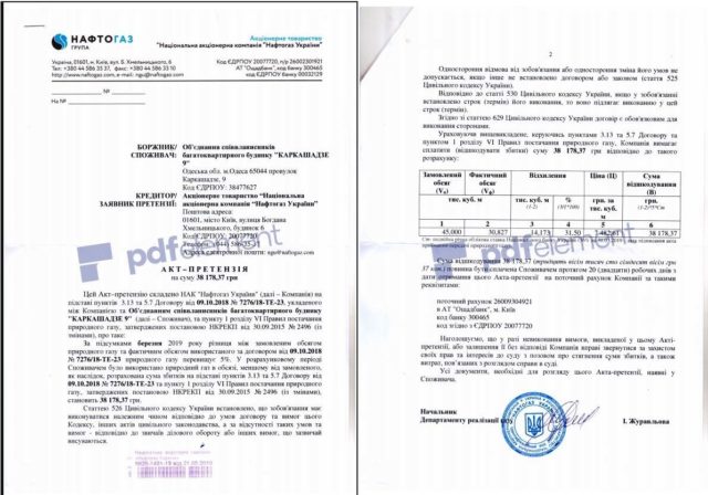 В жовтні 2018 року «Нафтогаз» і ОСББ уклали договір, за яким Об’єднання замовило на березень 2019 року 45 тис кубометрів газу. Але у вказаному місяці палива було спожито на третину менше. В своєму акті-претензії «Нафтогаз» стверджує, що ця різниця за угодою з ОСББ не повинна перевищувати 5% від замовлення. Тому держкомпанія вимагає сплатити невикористані обсяги з розрахунку 7 483 грн. за тисячу кобумотрів, що у випадку ОСББ «Каркашадзе 9» становить 38 тис грн. Ці кошти «Нафтогаз» у акті називає «відшкодуванням збитків».
