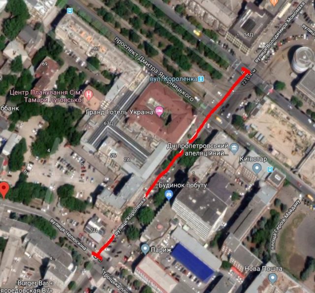 На перехресті вулиці Короленка та проспекту Яворницького знаходяться зокрема «Гранд Готель Україна» у будинку Хреннікова і Дніпропетровський апеляційний господарський суд. Зокрема там перевлаштують інженерні мережі, збудують залізобетонні конструкції та підстильні шари доріг, два фонтани, облицьовані гранітом сходи і доріжки, доріжки із плитки, зовнішнє освітлення, систему електропостачання і поливальний водопровід, виконають озеленення.