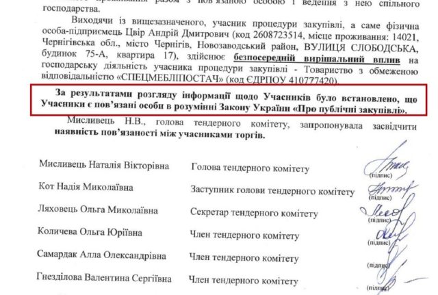 Самі торги завершились неуспішно – замовник провів самостійну перевірку структури власності «Спецмебліпостачу» та виявив, що підприємство разом із підприємцем-конкурентом – є пов’язаними особами у розумінні Закону «Про публічні закупівлі».