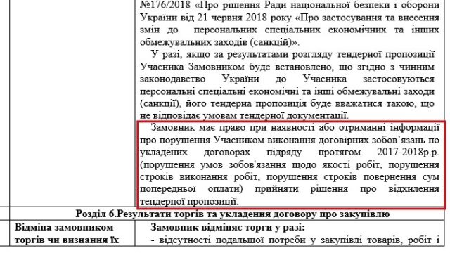Однією з вимог тендерної документації замовник передбачив для себе право відхилити тендерну пропозицію учасника при отриманні інформації про порушення ним виконання договірних зобов’язань по укладених раніше договорах-підряду від 2017-2018 років.