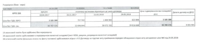 «Hyosung»-«Mewako» Тендерна ціна, січень 2018 (курс 28,84) «Mewako»-«СВС». Митниця, травень-червень 2018 (курс 26,30) Тендерна ціна від «КЕБК», травень 2019 (курс 26,48) «СВС»-«КЕБК», дельта