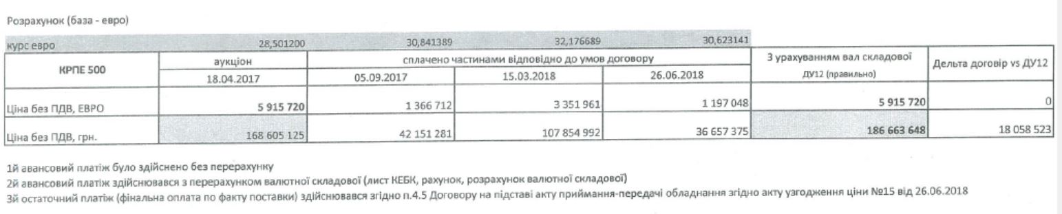 Перерахунок ціни замовником було проведено за формулою, відповідно до якої перераховується гривневий еквівалент вартості іноземного обладнання на момент оплати. Вона визначена п. 4.2 проекту Договору підряду (Додаток 4 до тендерної документації), відповідно до вимог пункту 7 частини 4 статті 36 ЗУ «Про публічні закупівлі».