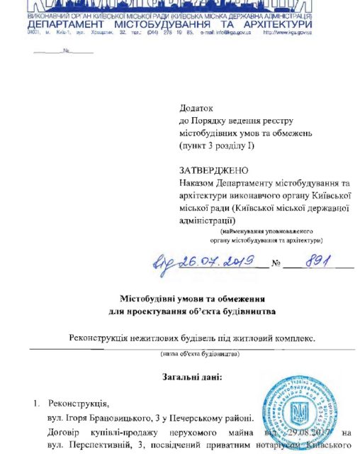 Департамент містобудування КМДА 26 липня видало ТОВ «Расмус» містобудівні умови та обмеження (МУО) на забудову ділянки на вул. Ігоря Брановицького, 3 у Печерському районі Києва. Про це свідчать дані офіційного сайту Департаменту.