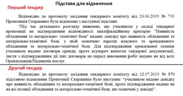 Таким чином один і той самий замовник у межах різних тендерів відхилив пропозиції двох учасників за однакові претензії:
