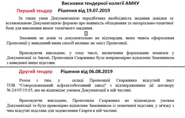 Йдеться про рішення органу оскарження від 19 липня та 6 серпня 2019 року, що були прийняті у межах дорожніх тендерів Управління капітального будівництва Чернігівської ОДА.