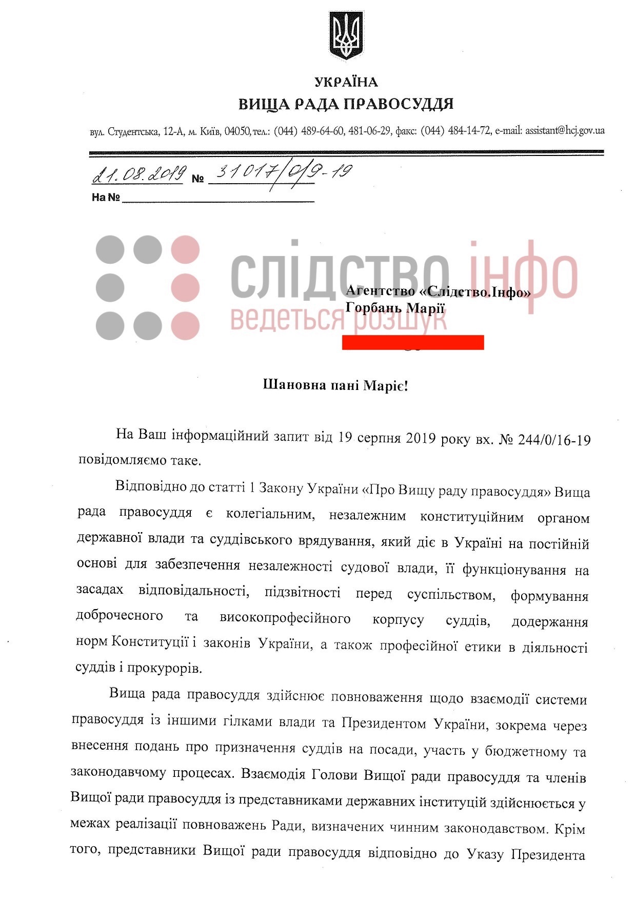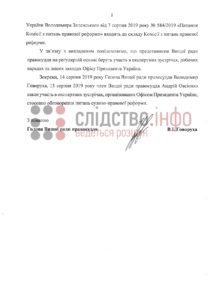 «14 серпня 2019 року голова Вищої ради правосуддя Володимир Говоруха та 15 серпня 2019 року член Вищої ради правосуддя Андрій Овсієнко взяли участь в експертних зустрічах, організованих Офісом Президента України, стосовно обговорень питань судово-правової реформи», — йдеться у відповіді ВРП.