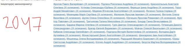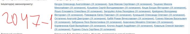 Законопроект 2047-1 за підписом 19 нардепів від «Слуги народа» внесено 13 вересня. Серед підписантів близькі президенту Володимиру Зеленському депутати – актор «Кварталу 95» Юрій Корявченков і маркетолог «Кварталу 95» Ольга Руденко.