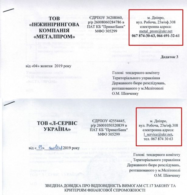 ТОВ «Л-Сервіс Україна» та ТОВ «Інжинірингова компанія «Металпром» на цій закупівлі у якості контактного вказували однаковий номер телефону – 0678743063. Окрім цього, згідно метаданих, зображення, подані у складі тендерної документації були створені на одній комп’ютерній техніці.