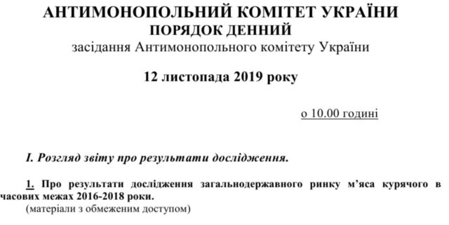 Сьогодні, 12 листопада, Антимонопольний комітет планує розглянути результати дослідження загальнодержавного ринку курячого м’яса, у якому будуть «матеріали з обмеженим доступом». Спробуємо передбачити про що буде йти мова за закритими від журналістів дверями.
