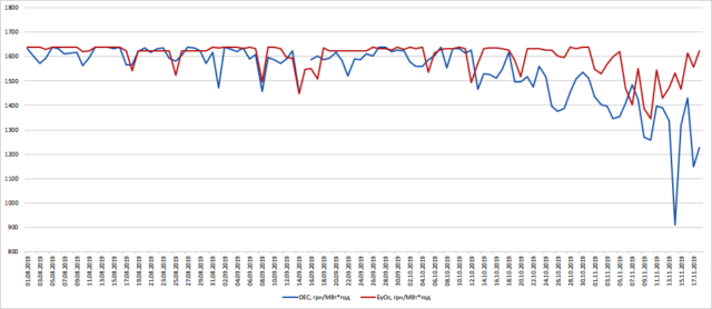 На графіку результат того, що Герус&ко випхали державне «Центренерго» зі зрозумілим Коломойському менеджментом у листопаді на ринок на добу наперед і спростили імпорт електроенергії з Білорусі та Роіссі. Таке збільшення конкуренції у купі зі збільшенням роботи АЕС, вітроенергетики і падінням промислового попиту миттєво допомогло обвалити ціни в Україні (синя лінія):