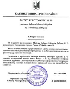 У документі сказано, що по кадрових питаннях на засіданні Кабміну за пропозицією Дмитра Дубілета вирішили порушити дисциплінарне провадження стосовно голови АРМА Янчука. А комісії з питань вищого корпусу державної служби в установленому порядку доручили здійснити дисциплінарне провадження та за його результатами внести на розгляд уряду відповідні пропозиції.