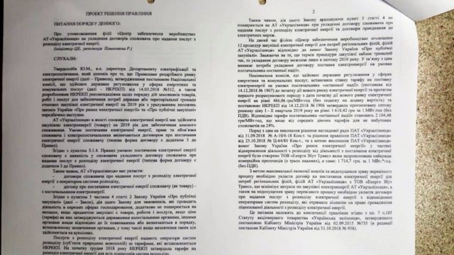За словами екс-начальника департаменту електропостачання «УЗ» Валерія Людмирського, в кінці 2018 року на розгляд правління «УЗ» винесли проект рішення Про уповноваження філії «Центр забезпечення виробництва» на укладання договорів споживача про надання послуг з розподілу електричної енергії. Опублікований Людмирським текст цього рішення передбачав укладання договору з «Енерго Збут Трансом» на поставку електроенергії для філій за ціною 1,71 грн грн./кВт*год. Однак рішення нібито було заблоковане двома членами правління, яких потім звільнили. Водночас у січні-червні 2019 року «УЗ» без торгів брала електроенергію в «Енерго Збут Трансу» по ціні, за якою він купував її у ДП «Енергоринок». У січні-липні 2019 року ціна для «Енерго Збут Трансу» на Оптовому ринку електроенергії становила в середньому 1,60 грн./кВт*год., що на 7% дешевше.