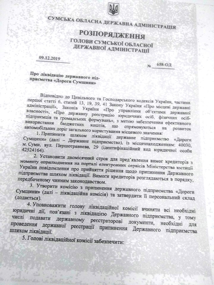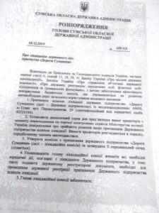 Держпідприємство «Дороги Сумщини» почало процедуру ліквідації згідно розпорядження керівника Сумської облдержадміністрації Ірини Купрейчик. Відповідні дані про припинення діяльності підприємства, що було замовником ремонтів для місцевих доріг, вже внесено в ЄДРЮО.
