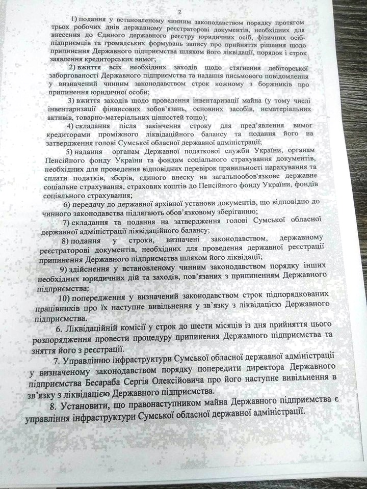 Також у розпорядженні вказано про наступне звільнення директора ДП Сергія Бесараба у зв’язку з ліквідацією.