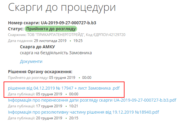 ТОВ «Прикарпатенерготрейд» завантажило скаргу до системи «Прозорро» 29 листопада, у п’ятницю, а Комітет опублікував рішення про прийняття її до розгляду – о 00:00 5 грудня. Фактично, АМКУ спізнився буквально на секунду, адже система зафіксувала датою публікації – уже 5 грудня, а не 4.
